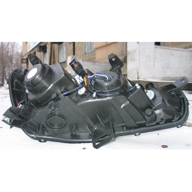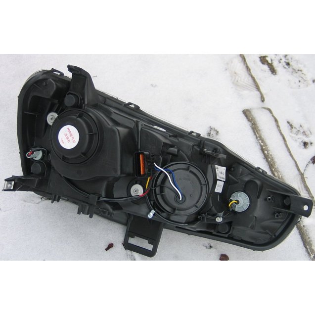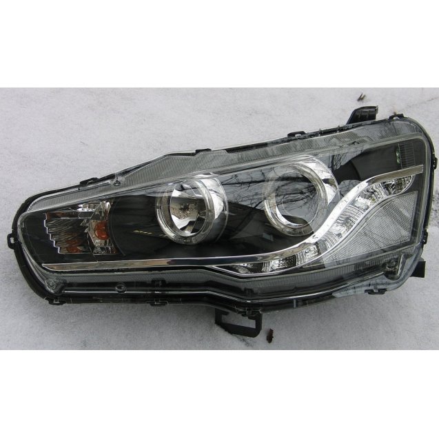 Передняя альтернативная оптика с линзой ближнего света для Mitsubishi Lancer X. Шторка оптики для ксенонового света. Светодиодный габарит. Цоколь лампы Н7 ближний,Н1- дальний.